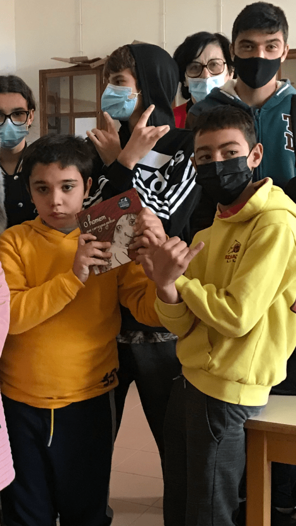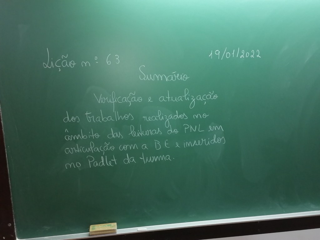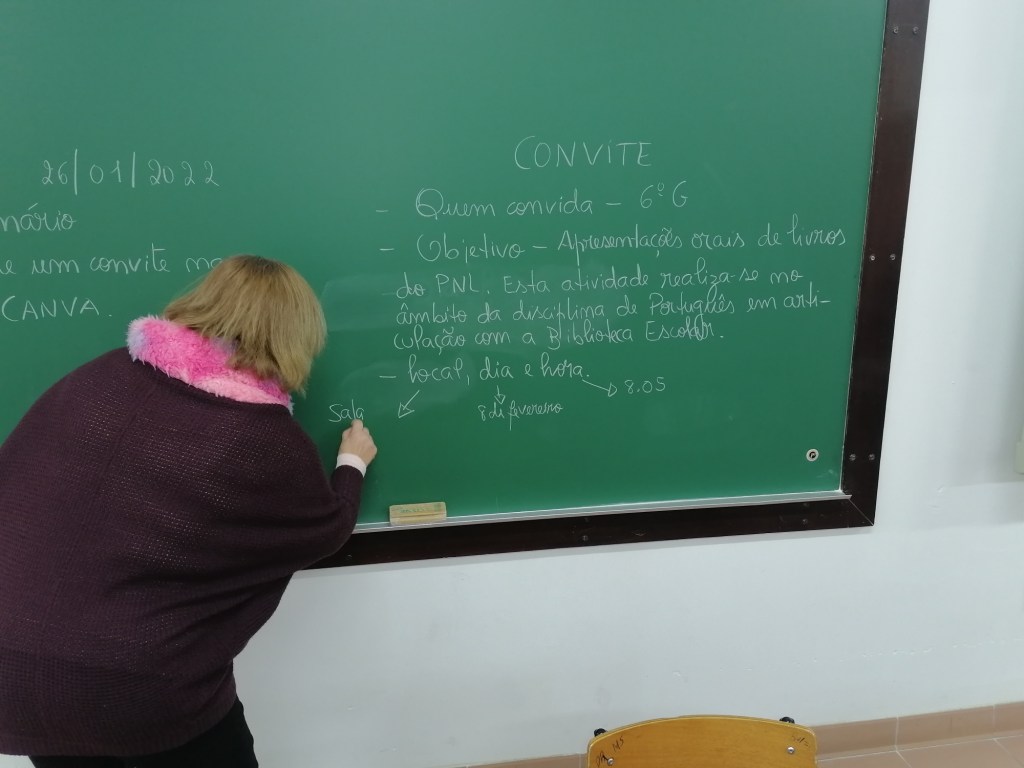 Foi proposto, para a próxima aula, a realização pelos alunos, de um convite aos Encarregados de Educação para assistirem à apresentação oral das obras lidas, na sala de aula ou na Biblioteca Escolar, tendo-se sugerido, que a mesma possa ser apresentada através de um vídeo.