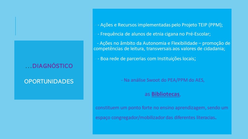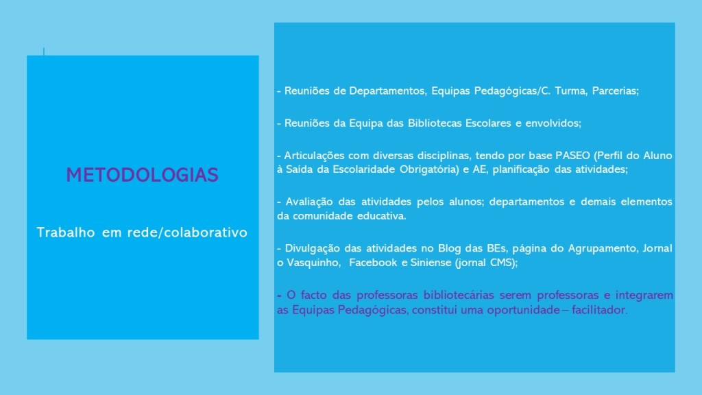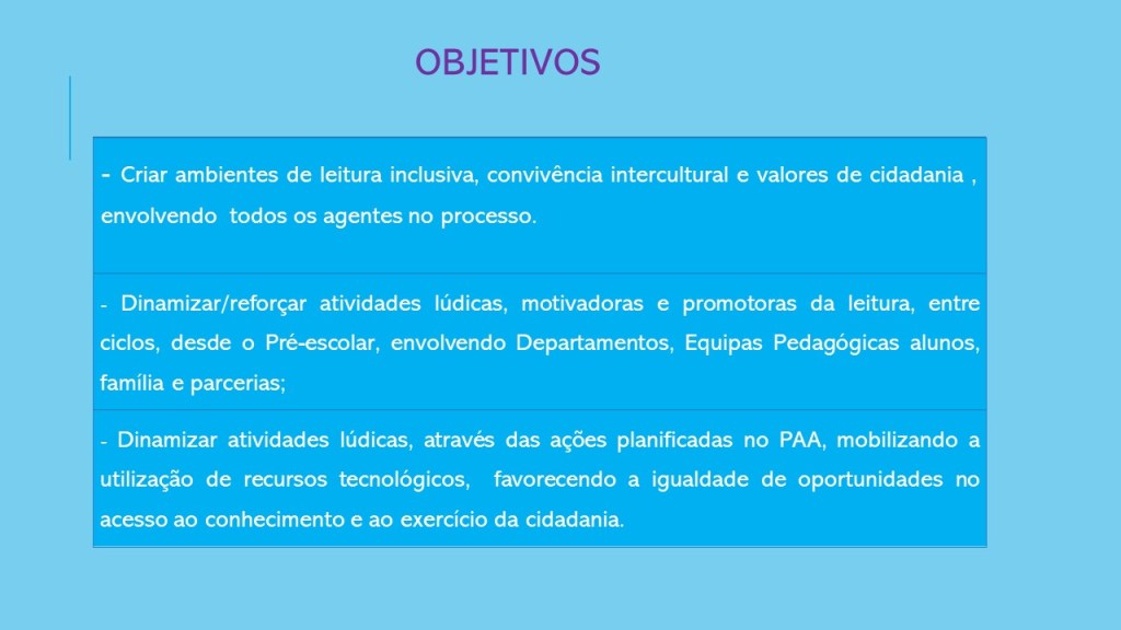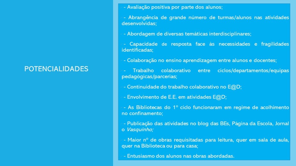 Neste ano letivo, as Bibliotecas Escolares, estão a dar continuidade ao Projeto Todos Juntos Podemos Ler, em resultado da candidatura efetuada à Rede das Bibliotecas Escolares, no ano letivo transato. A verba atribuída, permitiu a aquisição de fundo documental e algum equipamento. De referir que o próprio slogan do Projeto, vem de encontro ao slogan do nosso Agrupamento – Uma Escola de Todos para Todos – daí, que as leituras sejam, tanto quanto possível, inclusivas e possam comtemplar os nossos alunos, tendo em conta as suas origens, nacionalidades e diferenças. Na Biblioteca Vasco da Gama, foram preparados Kits de Leitura, tanto para o 1º como para o 2º período, tendo em conta algumas obras, também das adquiridas, e que pudessem ir de encontro aos currículos e necessidades das turmas. Foram enviadas informações às Equipas Pedagógicas e realizado um bom número de sessões de leitura na sala de aula, em articulação com as diversas disciplinas. No 1º e 2º ciclo, foram também realizadas sessões de leitura, nomeadamente através das Bibliotecas das Escolas nº 1 e nº 3, sendo as mesmas também transversais a outras atividades de leitura do PAA.